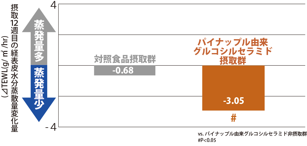 | 試験食品 | パイナップル由来グルコシルセラミド摂取群・パイナップル由来グルコシルセラミド 12mg/目を含む錠剤 パイナップル由来グルコシルセラミド非摂取群:外見が同一でパイナップル由来グルコシルセラミドを含まない錠剤 |